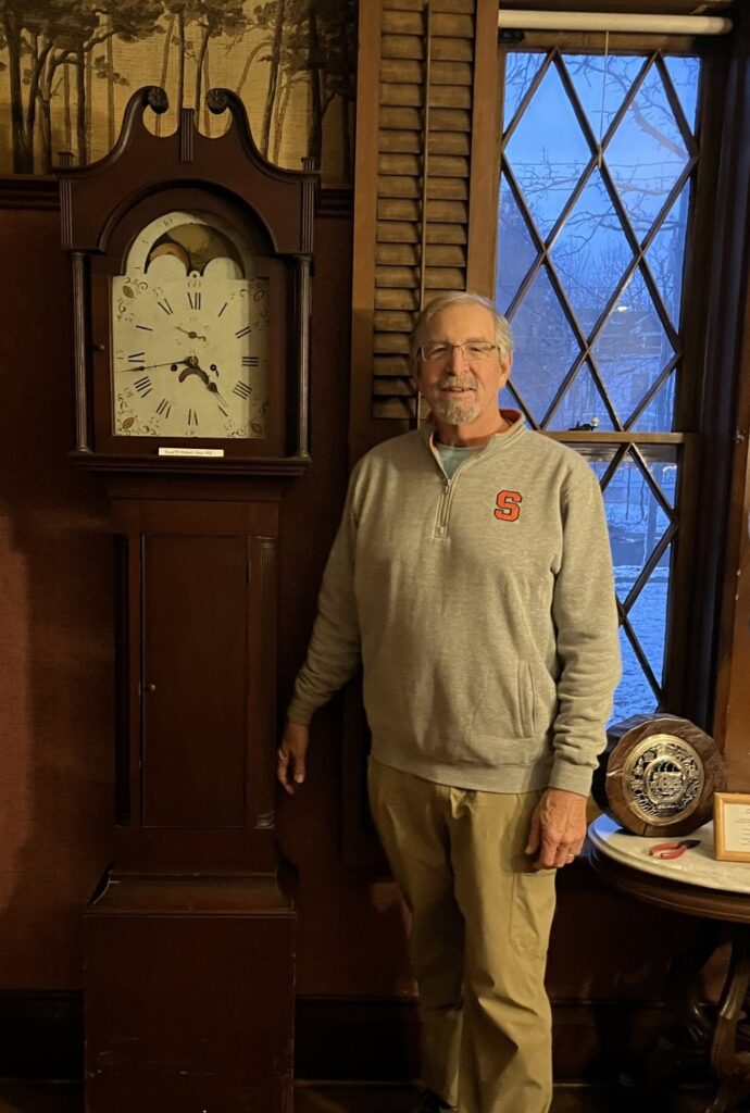 Russ Oechsle is a long-time researcher and collector of Upstate New York clocks and clock makers. His first articles on Madison County clocks appeared in the early 1980s in the Madison County Heritage. Oechsle was the co-author of the 2003 National Association of Watch & Clock Collectors book “An Empire in Time – Clocks and Clock Makers of Upstate New York,” and has written articles for numerous presentations to local and national interest groups and historical societies. He was once a Board Member of the Madison County Historical Society and previously donated to the Historical Society in the past. The Samuel W. Chubbock tall clock that stands in the Dining Room of Cottage Lawn was another donation by Russ only a few years ago. He had also provided the Historical Society with 21 rare early American shelf clocks for a temporary exhibit back in 2021 held throughout the rooms at the Cottage Lawn.