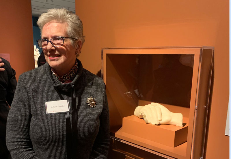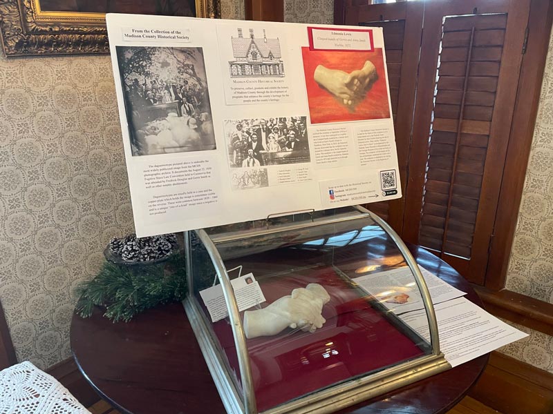 The Madison County Historical Society is excited to announce that an item from our collection is now on what will be an 18 month journey as part of an historic multi-museum exhibition. A marble sculpture of the clasped hands of Gerrit Smith and his wife Ann, is featured in the first major retrospective exhibition of the work of acclaimed 19th-century black and indigenous sculptress Edmonia Lewis. It is among thirty sculptures by Lewis from public and private collections across the United States and abroad that have been brought together with a number of additional objects in a range of media, in an exhibition entitled “Edmonia Lewis: Said in Stone” that made its debut at the Peabody Essex Museum (PEM) in Salem, MA on February 14, 2026 running through June 7, 2026. MCHS Board President Colleen Donahue was in attendance at the opening night in Salem. The exhibition will next move to the Georgia Museum of Art from August 8, 2026 to January 3, 2027, and the North Carolina Museum of Art from April 3 to July 11, 2027.